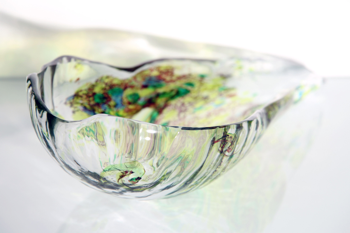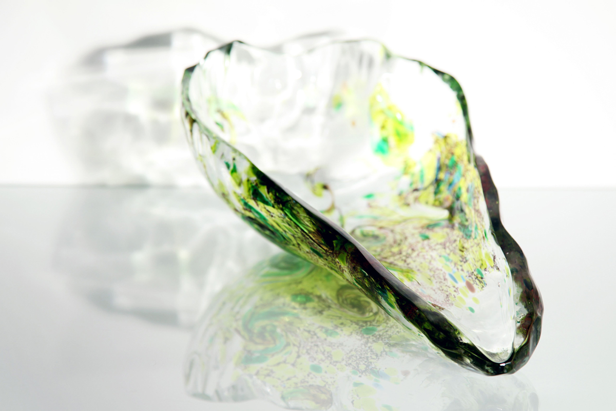 Název motýlí křídlo jsem dala několika mísám, jelikož se jedná o jednu kolekci, ve které na sebe tvary i barvy vzájemně navazují a tvoří tak ucelenou kolekci s názvem Motýlí křídlo. Při broušení jsem hledala nový přístup k tvaru a s ním spojený přístup k broušení, který míse dává její konečnou podobu.