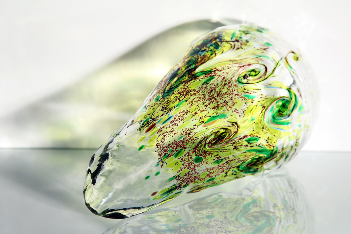 Technika: ručně foukané sklo, broušené a leštěné. Rozměry: 47 x 23 cm