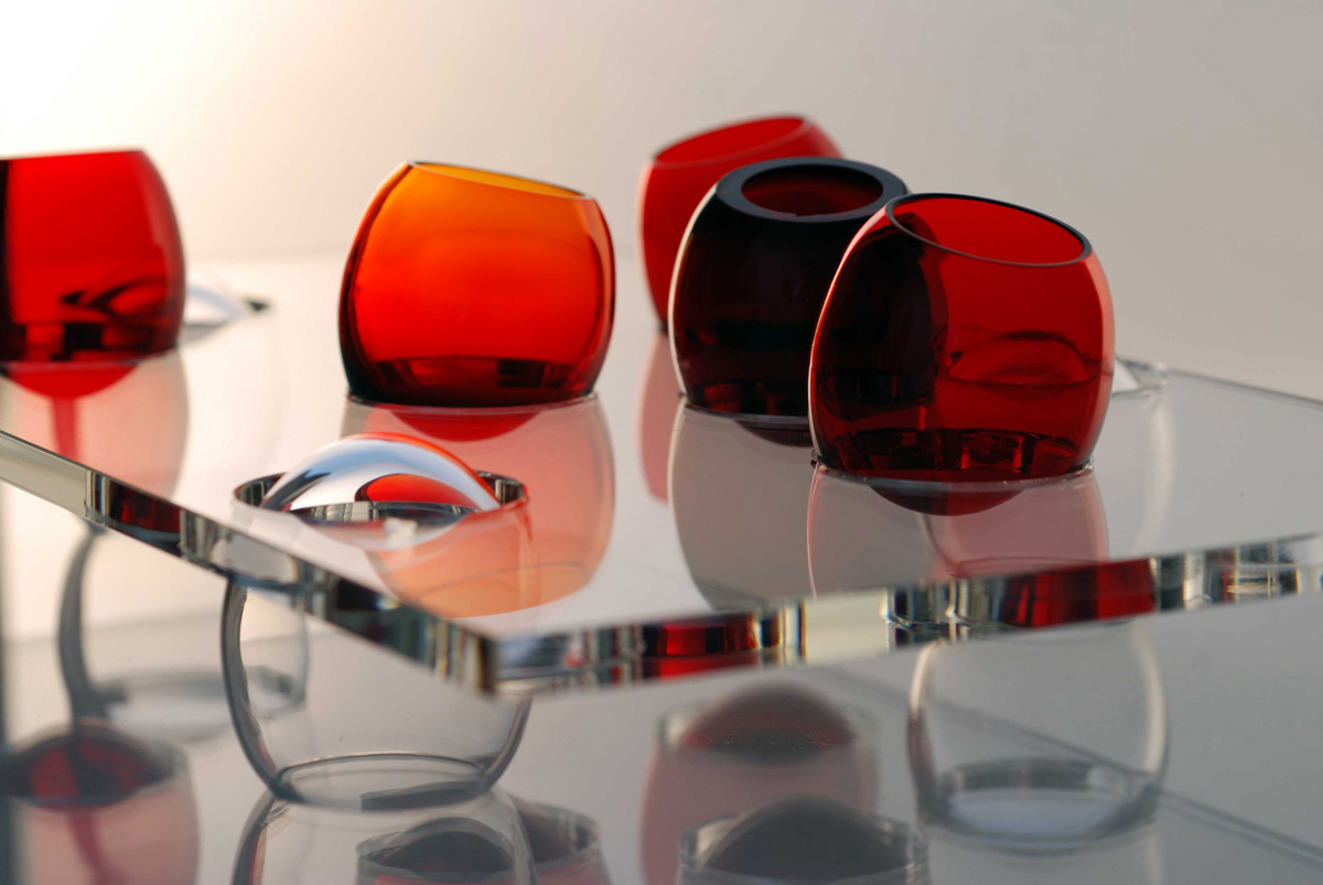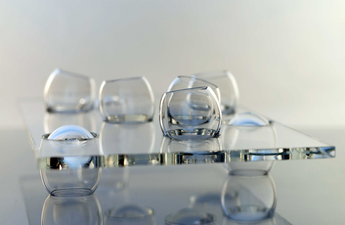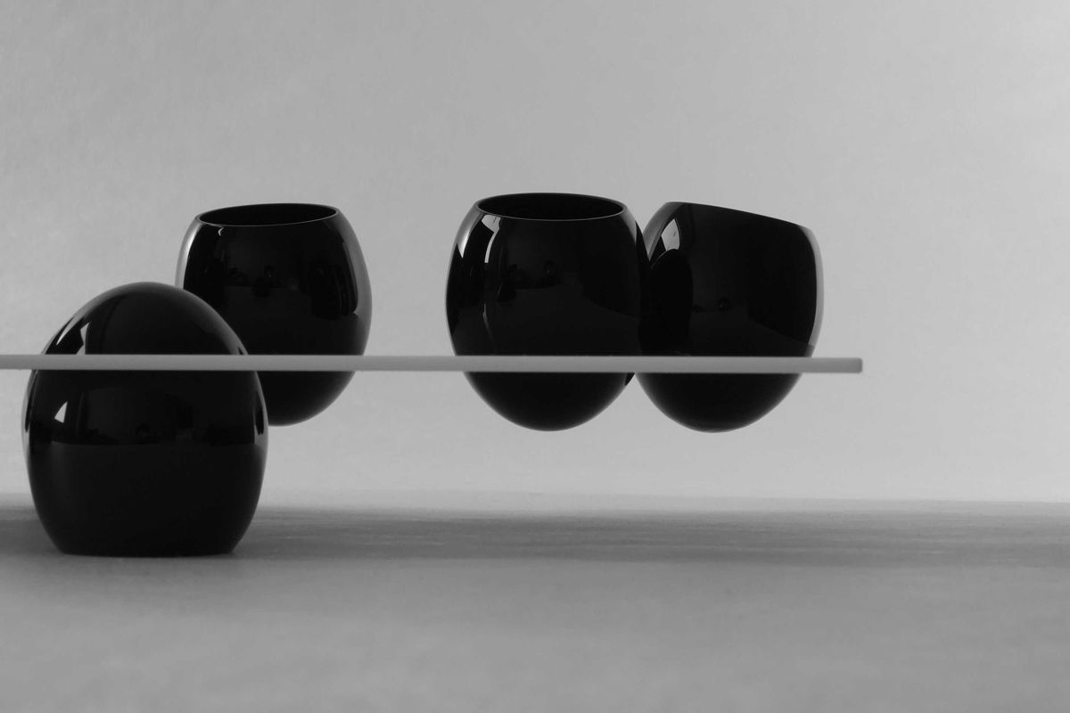 Štamprlatový set s deskou vznikl v křišťálové, černo-bílé a zrcadlové variantě. Soubor malých foukaných štamprlat vychází z reálného rozměru vajíčka. Proto jsem zvolila název OVO, který odkazuje k vejci. Ve starých kulturách symbolizovalo vejce zárodečný chaos, ze kterého vznikl svět, ale také životní sílu. Tato práce vznikala pro výstavu v Miláně Salone Internazionale del Mobile, jejíž téma byla - hostina pro návštěvu z jiného světa (A Fiest for Visitors from Another World), práci jsem pojala jako výpověď o mě o mojí kultuře, protože si myslím že i věci pro běžnou denní potřebu jsou nositeli znaků naší historie, kterou jsme součástí. Variant je několik a každá z nich nechává vyniknout rozdílnému působení materiálu. Černo bílá varianta je minimalistická, čistá. Zrcadlová s pokovenými štamprlaty je spojena se symbolikou zrcadla.